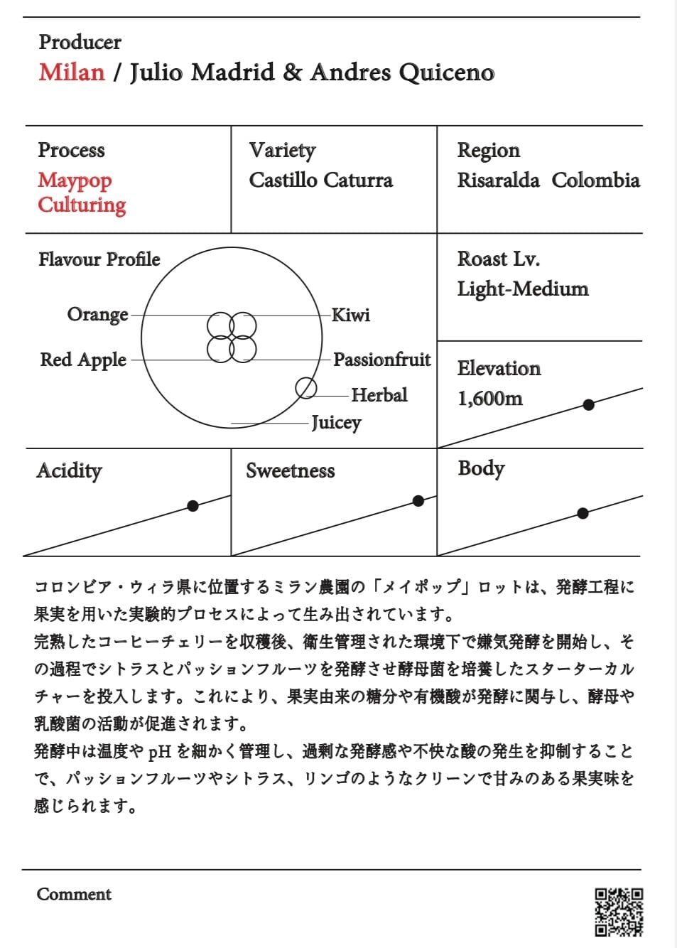 コロンビア・ウィラ県に位置するミラン農園の「メイポップ」ロットは、発酵工程に果実を用いた実験的プロセスによって生み出されています。