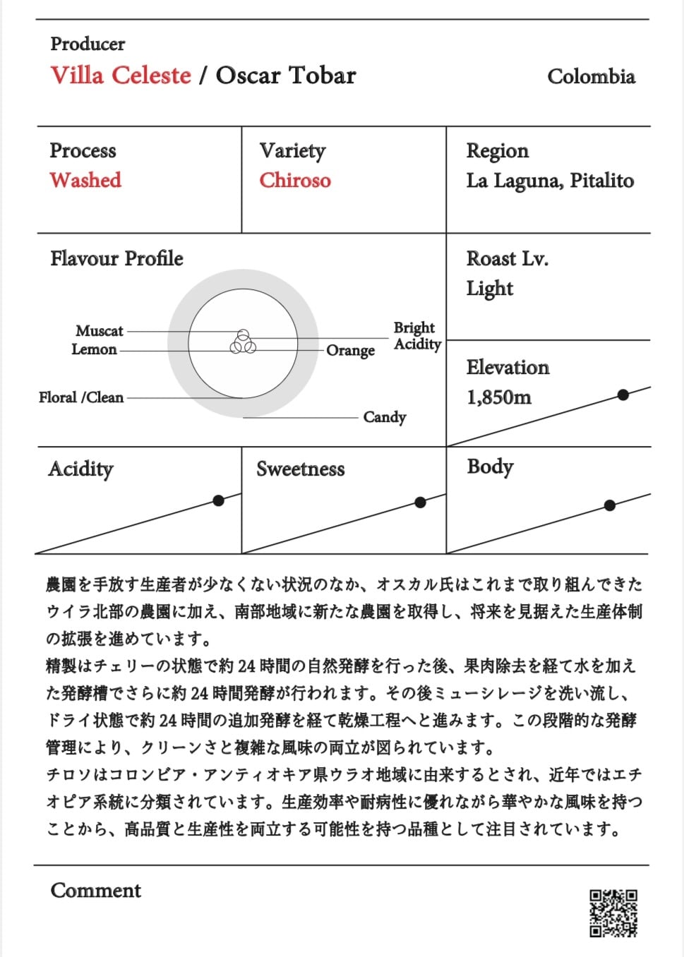 チロンはコロンビア・アンティオキア県ウラオ地域に由来するとされ、近年ではエチオピア系統に分類されています。生産効率や耐病性に優れながら華やかな風味を持つことから、高品質と生産性を両立する可能性を持つ品種として注目されています。